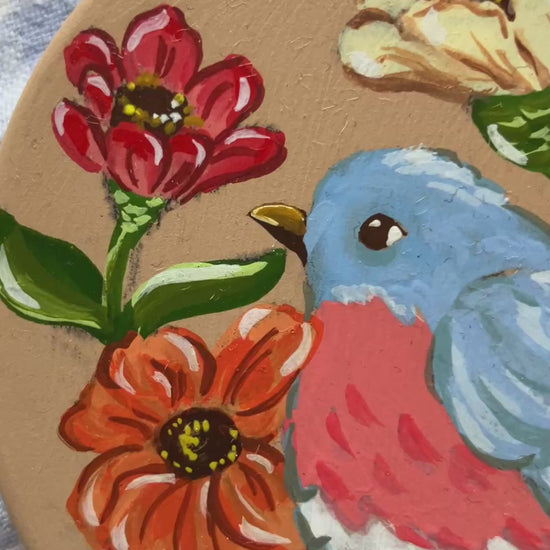Painted with watercolor and gouache and fixed with a sealant. Please handle with extreme care and keep very far away from moisture.