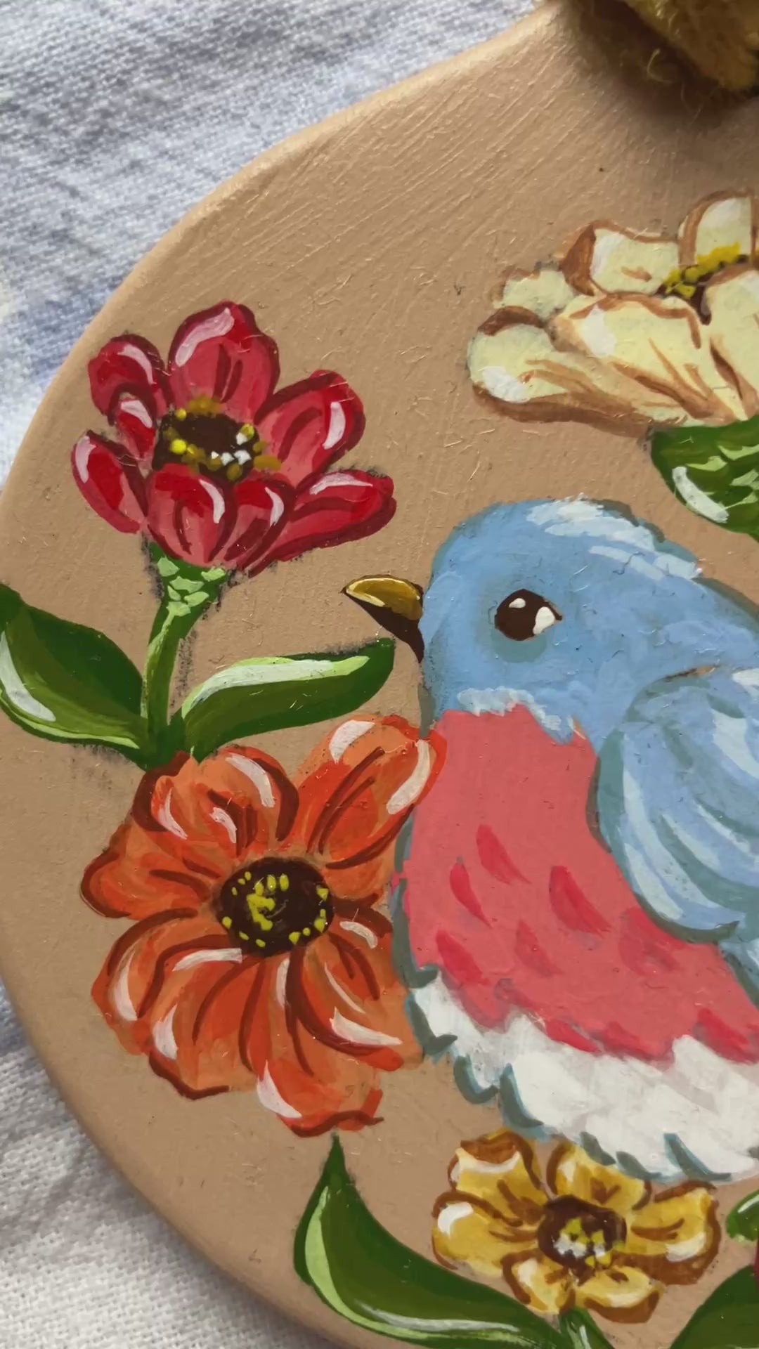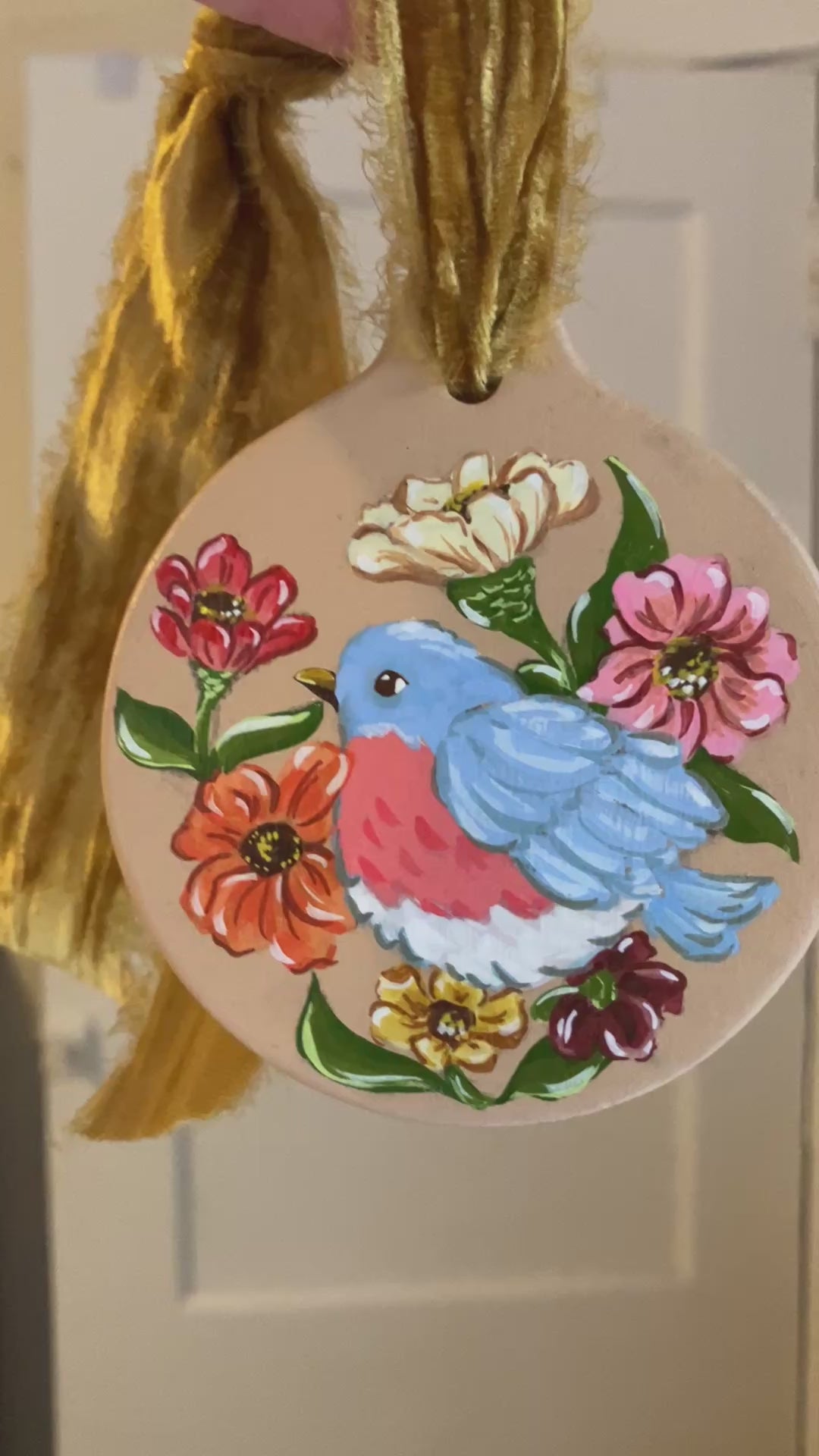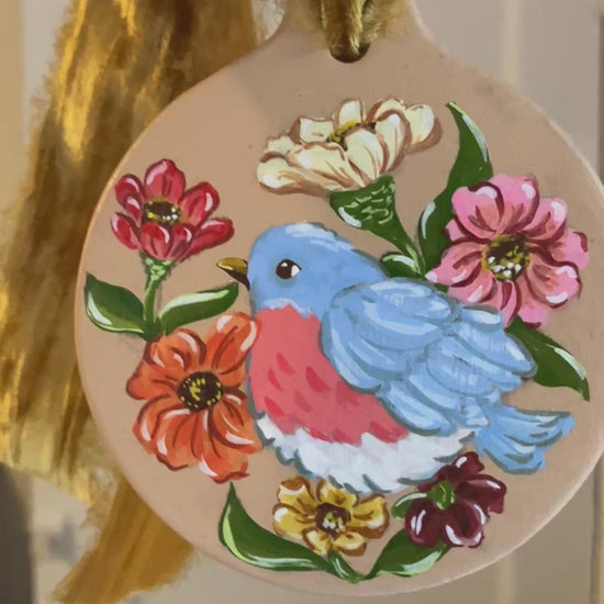A sweet hand-painted ceramic ornament, ready to hang with lovely, velvety ribbon.