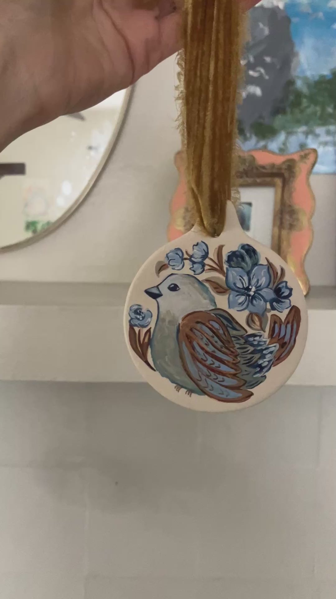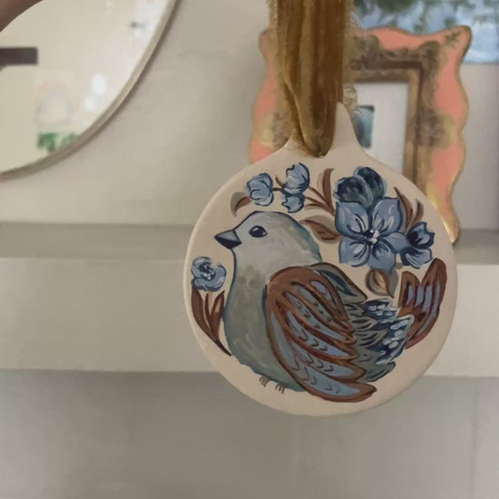 A sweet hand-painted ceramic ornament, ready to hang with lovely, velvety ribbon.