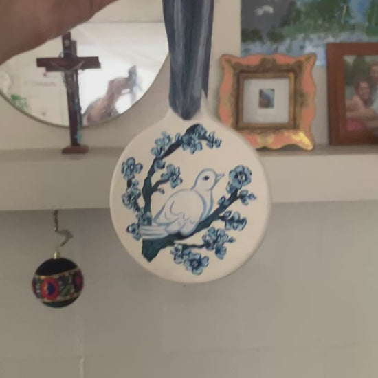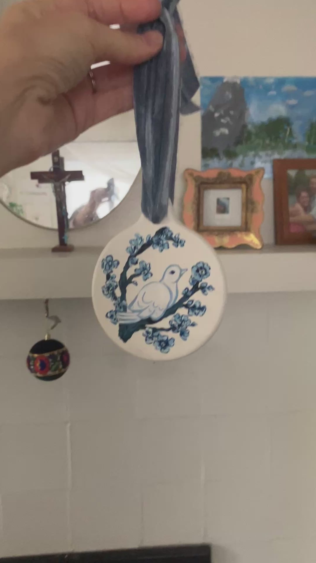 A sweet hand-painted ceramic ornament, ready to hang with lovely, velvety ribbon.