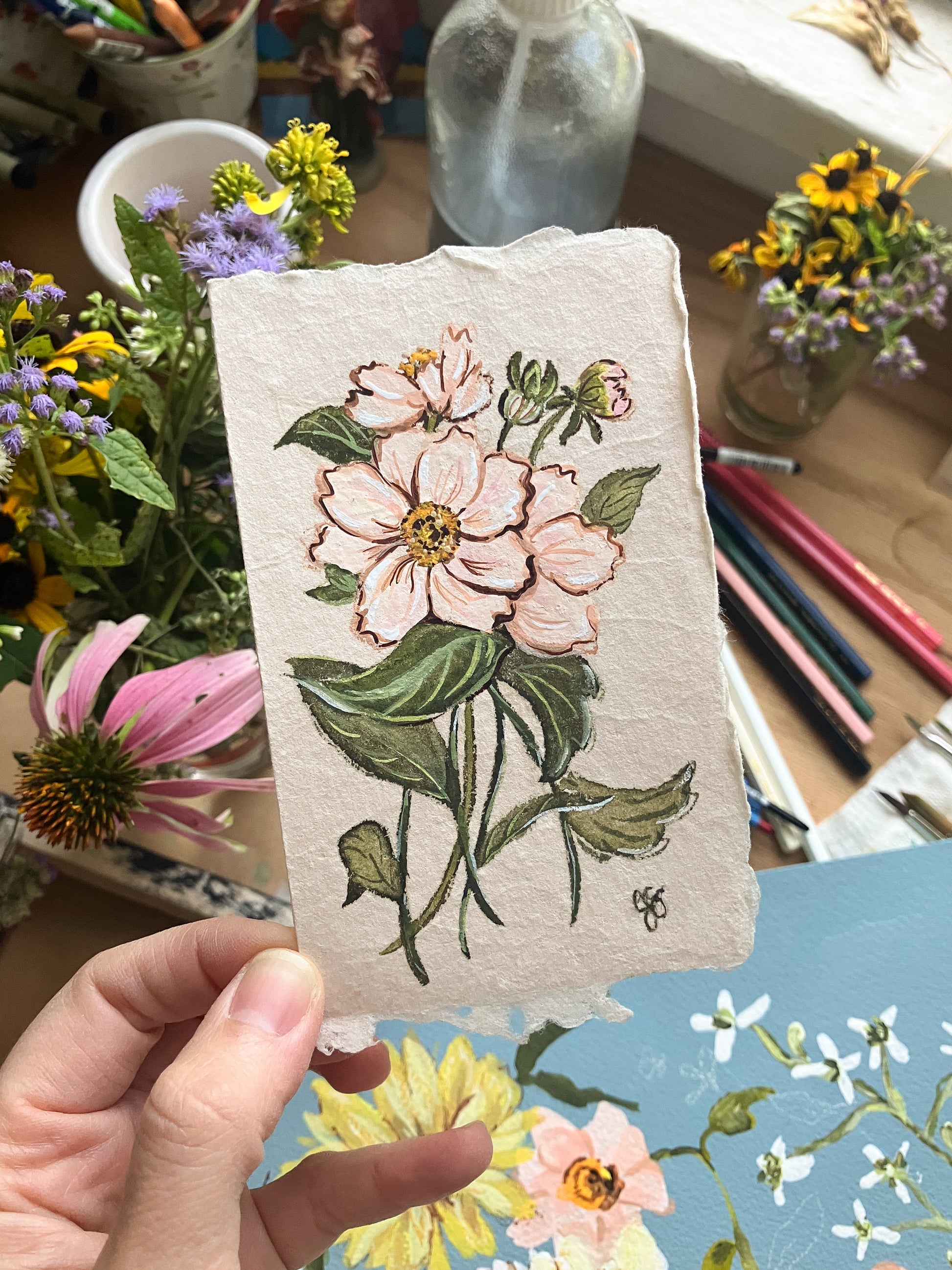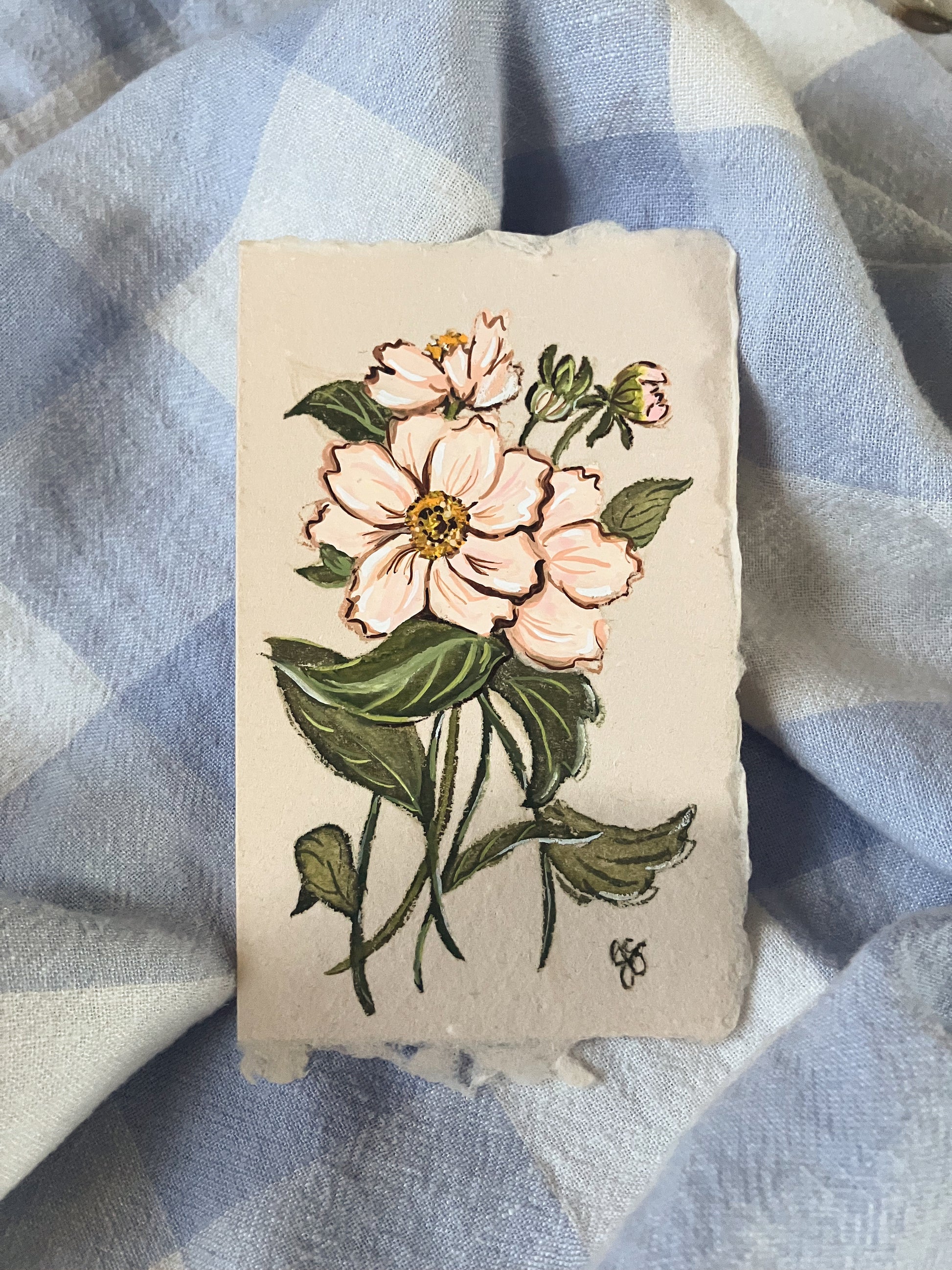 A little bunch of sweet, peachy dahlias. An original gouache painting on soft handmade paper.