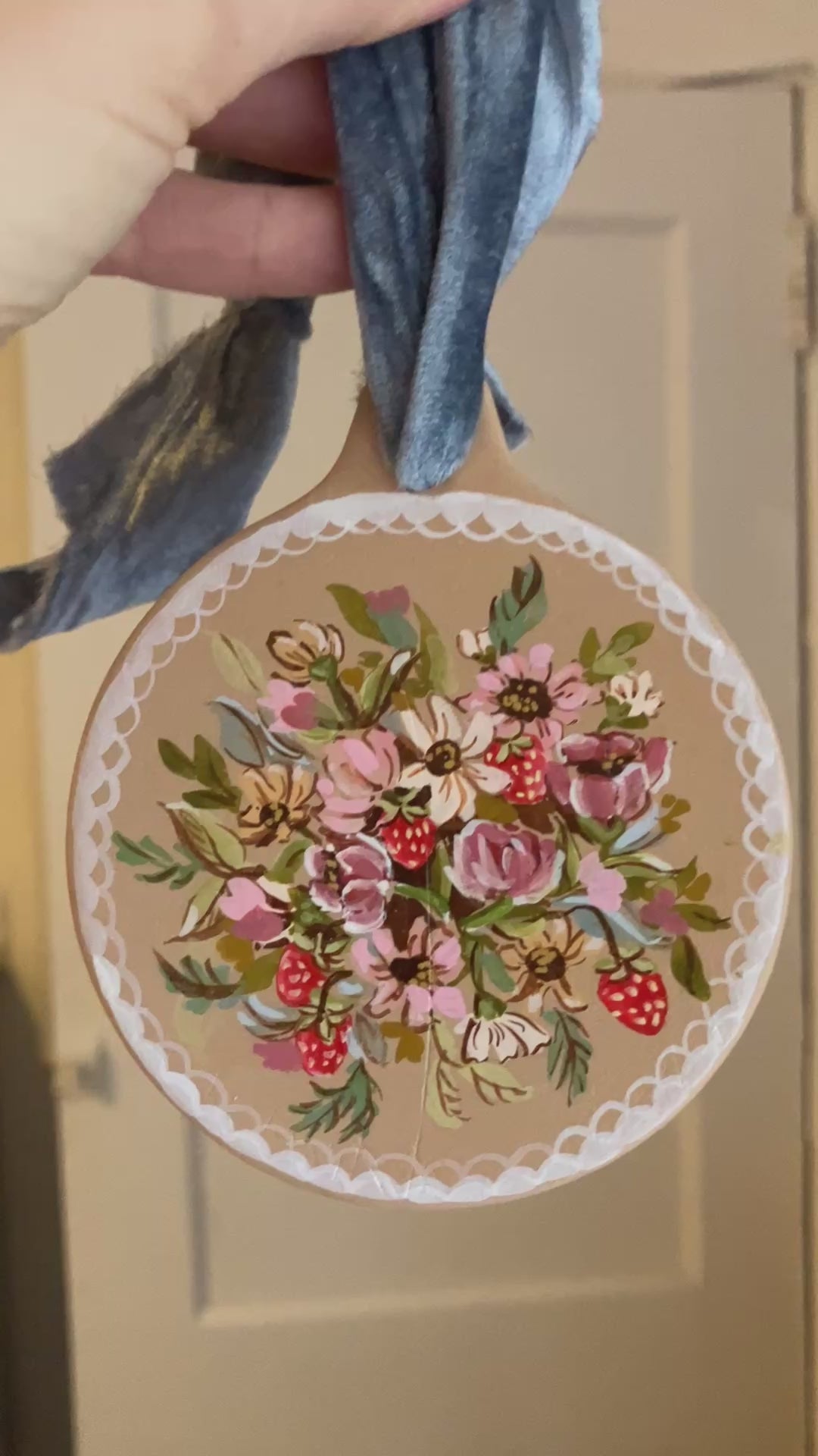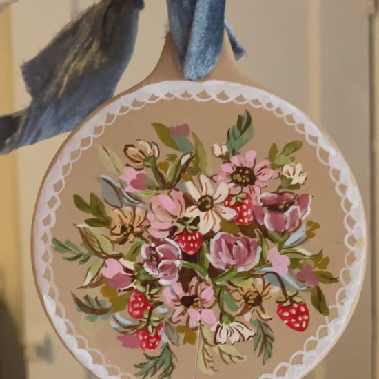 A sweet hand-painted ceramic ornament, ready to hang with lovely, velvety ribbon.
